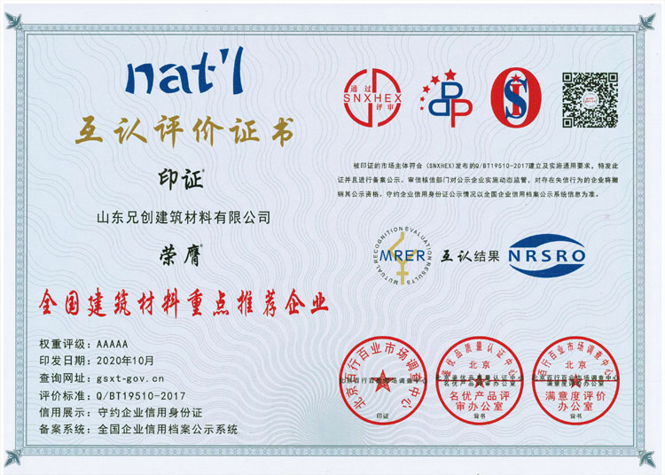 • 重點推薦企業互認評價證書-山東兄創建筑材料有限公司